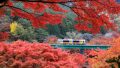 温泉街とも繋がる「桂橋」の赤と竹の緑だけでも、十分美しいのですが、秋になると紅葉も加わります。